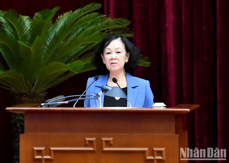 Đồng chí Trương Thị Mai, Ủy viên Bộ Chính trị, Thường trực Ban Bí thư, Trưởng Ban Tổ chức Trung ương phát biểu tại hội nghị. (Ảnh: Đăng Khoa)