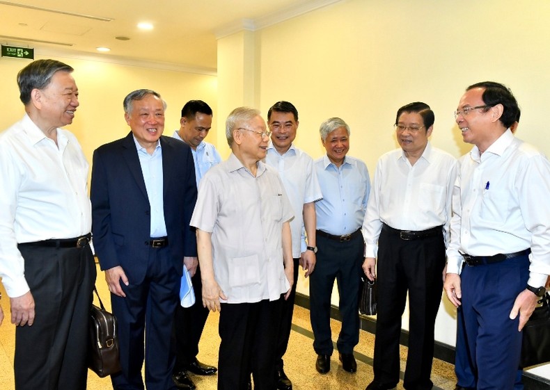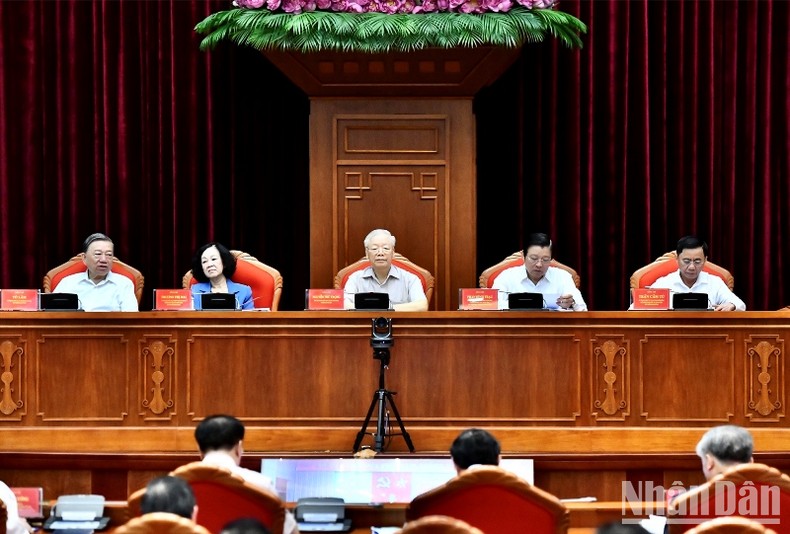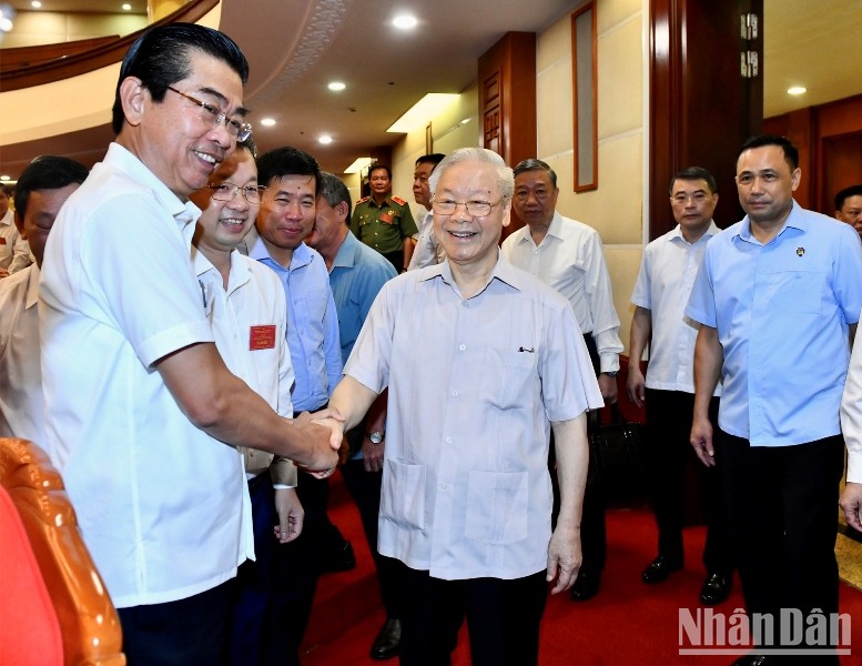 Sau khi nghe Báo cáo sơ kết và ý kiến thảo luận của các đại biểu, Tổng Bí thư Nguyễn Phú Trọng phát biểu kết luận Hội nghị, nêu một số vấn đề có tính chất khái quát để thống nhất lãnh đạo, chỉ đạo, tổ chức thực hiện, làm tốt hơn nữa trong thời gian tới.