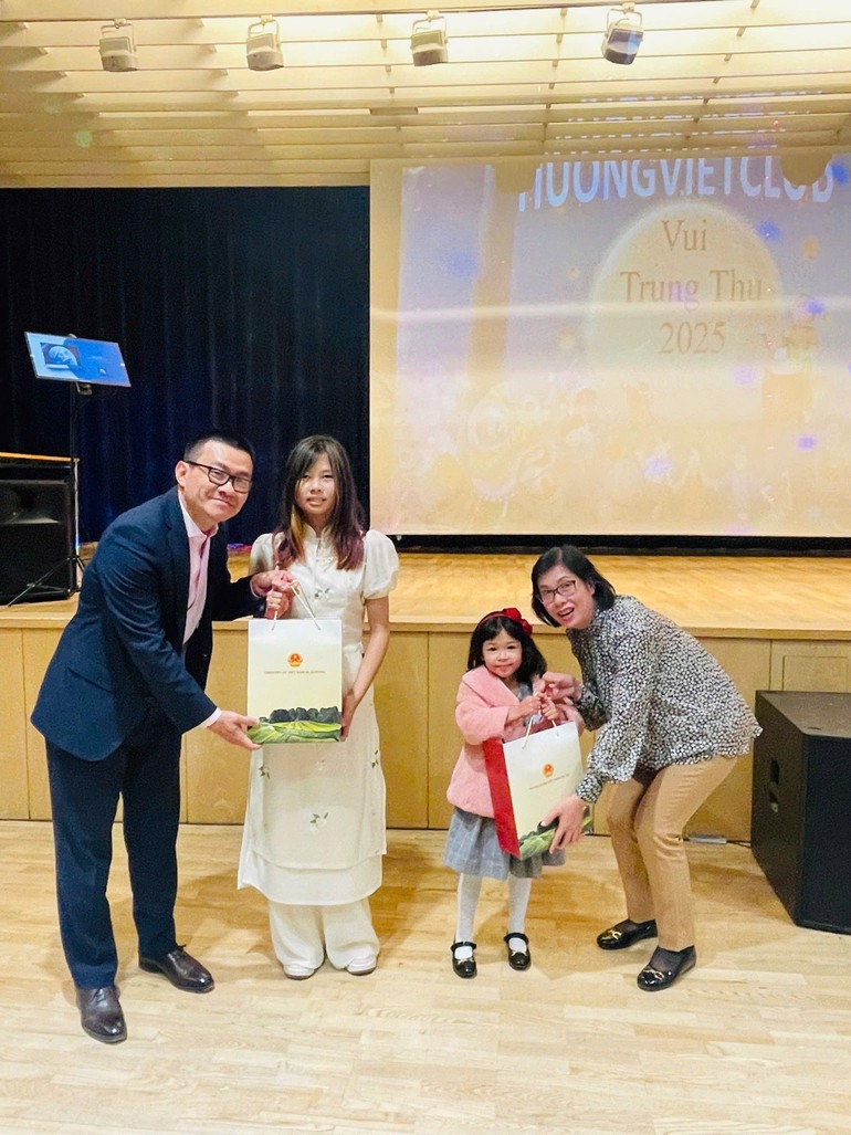 Nhân dịp này, Đại sứ Vũ Lê Thái Hoàng và phu nhân tặng quà Trung thu cho các cháu nhi đồng, thiếu nhi – thế hệ tương lai của cộng đồng người Việt Nam tại Áo.