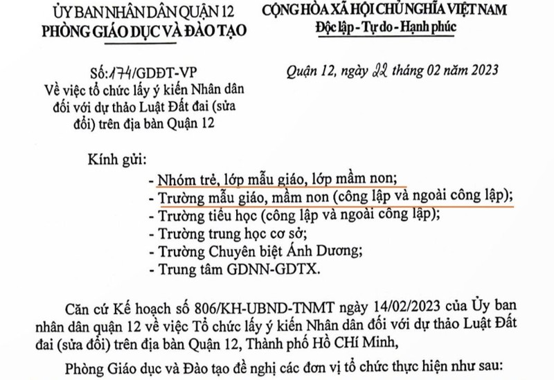 Cụ thể, ngày 22/2/2023, Phòng Giáo dục và Đào tạo Quận 12 có văn bản chỉ đạo về việc tổ chức lấy ý kiến nhân dân đối với dự thảo Luật Đất đai (sửa đổi) gửi tới: nhóm trẻ lớp mẫu giáo, lớp mầm non; trường mẫu giáo, mầm non (công lập và ngoài công lập); trường tiểu học (công lập và ngoài công lập), trường trung học cơ sở;...