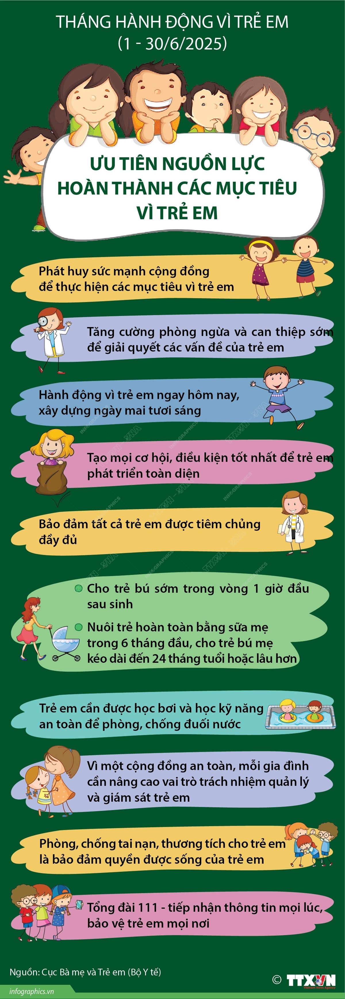 Diễn ra từ ngày 1/6 đến 30/6/2025, Tháng hành động vì trẻ em năm 2025 có chủ đề “Ưu tiên nguồn lực hoàn thành các mục tiêu vì trẻ em” nhằm tăng cường sự quan tâm của cộng đồng về công tác chăm sóc, giáo dục và bảo vệ trẻ em, đáp ứng yêu cầu phát triển đất nước phồn vinh, hạnh phúc; đẩy mạnh cung cấp các dịch vụ...