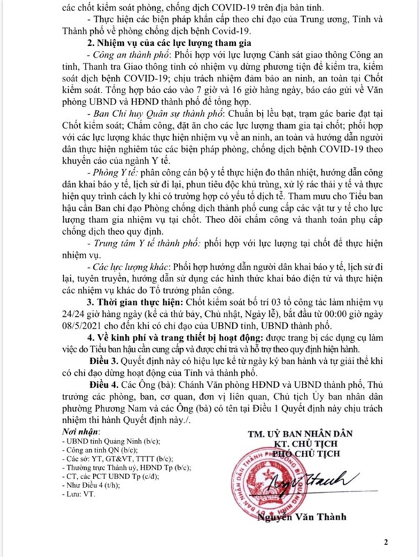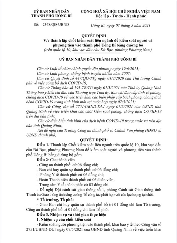 Ngày 7-5, Ủy ban nhân dân thành phố ban hành Quyết định số 2368/QĐ-UBND về việc thành lập chốt kiểm soát liên ngành để kiểm soát người và phương tiện vào TP Uông Bí bằng đường bộ.