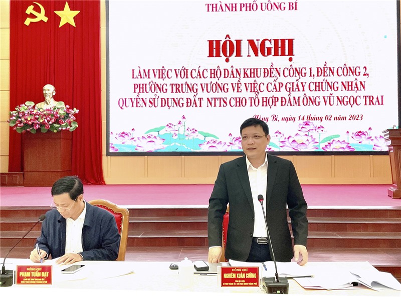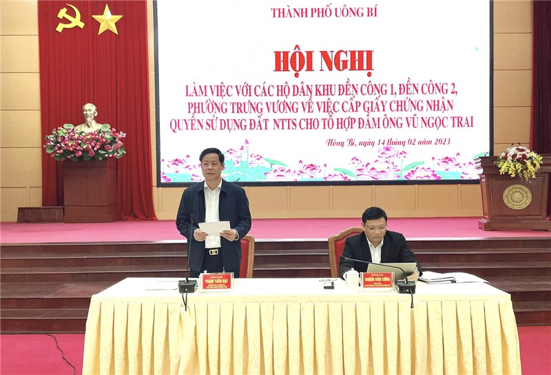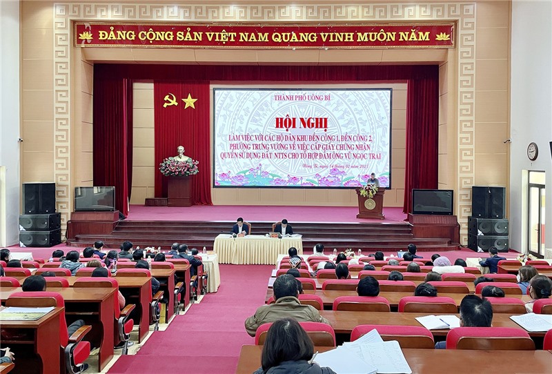 Ngày 14/2, TP Uông Bí tổ chức buổi làm việc với bà Vũ Thị Miên và các hộ dân trú tại khu Đền Công 1, Đền Công 2, phường Trưng Vương về việc cấp giấy chứng nhận quyền sử dụng đất nuôi trồng thủy sản cho tổ hợp đầm ông Vũ Ngọc Trai.