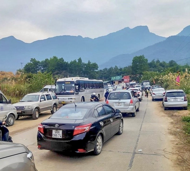 Hàng dài xe chở du khách thập phương hành hương lễ Phật tại Yên Tử.