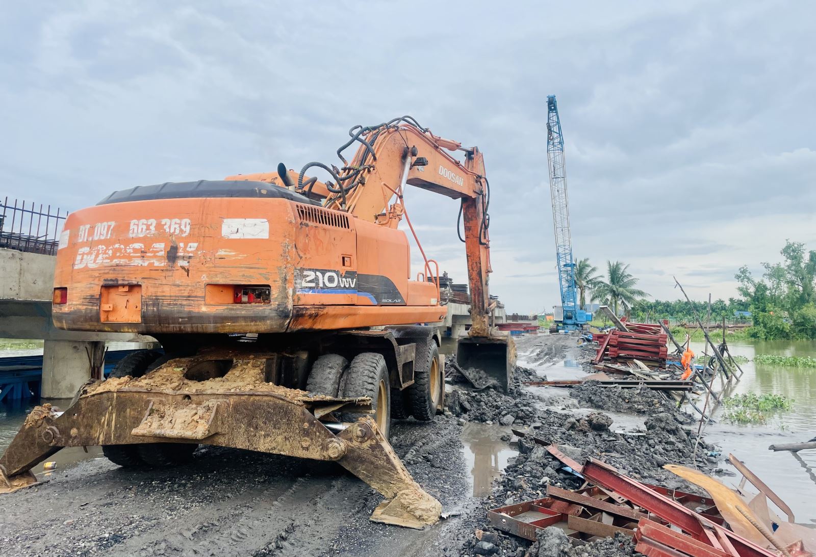 Huy động phương tiện, máy móc khơi thông dòng chảy sông Sến để thoát nước.