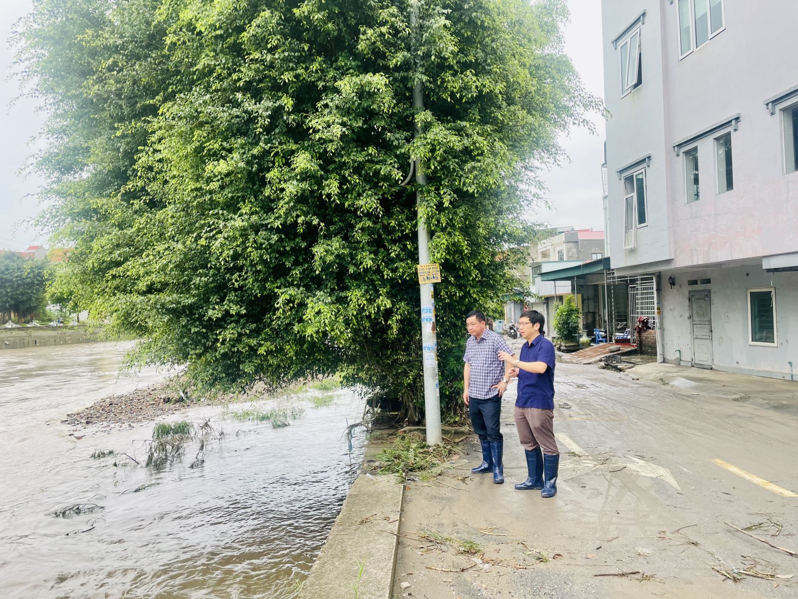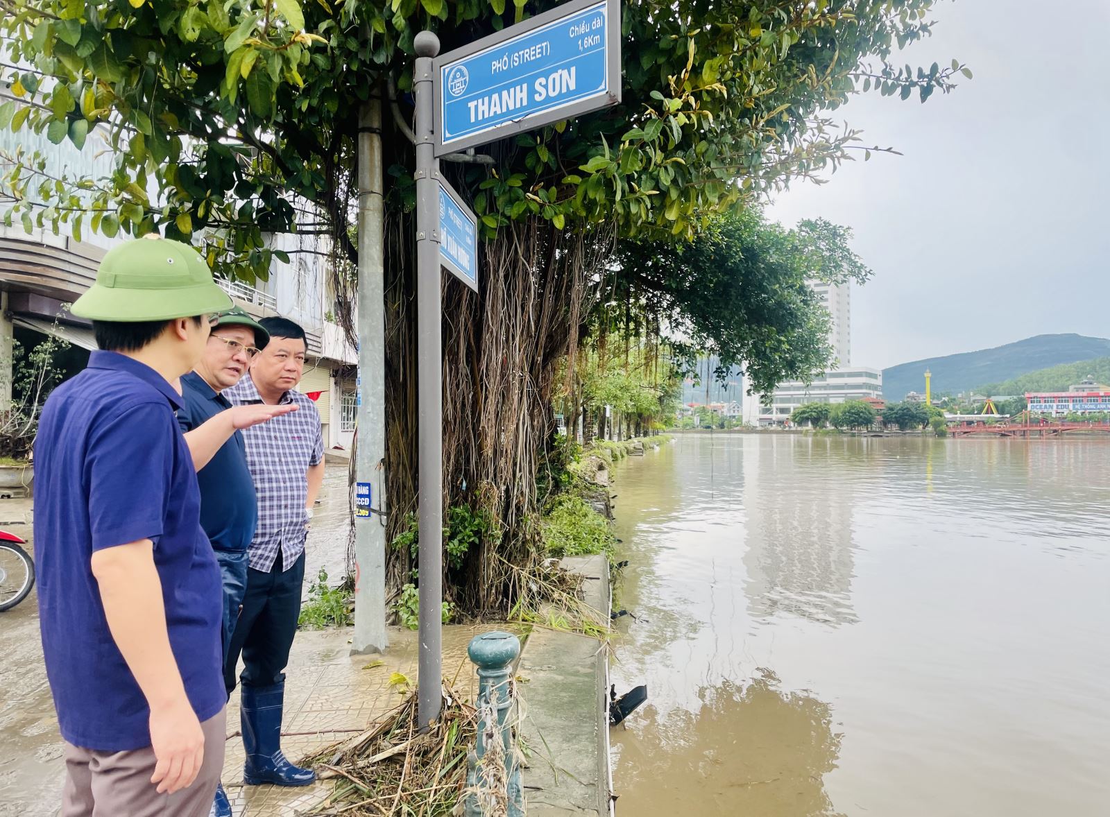 Đồng chí Nguyễn Đức Hoà, Phó Chủ tịch UBND thành phố kiểm tra một số khu vực bị ngập lụt tại phường Quang Trung, Thanh Sơn.