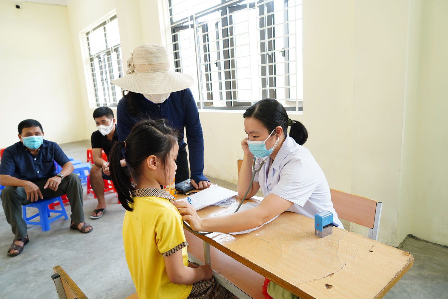 Học sinh được khám sàng lọc trước khi tiêm.