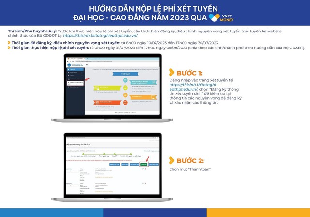 Từ ngày 31/7/2023 đến 17h ngày 6/8/2023, thí sinh cả nước có thể thanh toán lệ phí xét tuyển trực tuyến trên Hệ thống đăng ký xét tuyển đại học, cao đẳng năm 2023 nhanh nhất qua VietQR với VNPT Money.