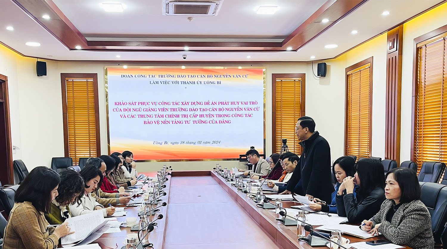 Ngày 28/02, Đoàn công tác của Trường đào tạo cán bộ Nguyễn Văn Cừ do đồng chí Phạm Hữu Kiên, Phó Hiệu trưởng nhà trường đã có buổi làm việc với Thành uỷ Uông Bí về nội dung khảo sát phục vụ nghiên cứu xây dựng đề án “Phát huy vai trò của đội ngũ giảng viên Trường đào tạo cán bộ Nguyễn Văn Cừ và các Trung tâm chính trị cấp huyện trong công tác bảo vệ nền tảng tư tưởng của Đảng”.