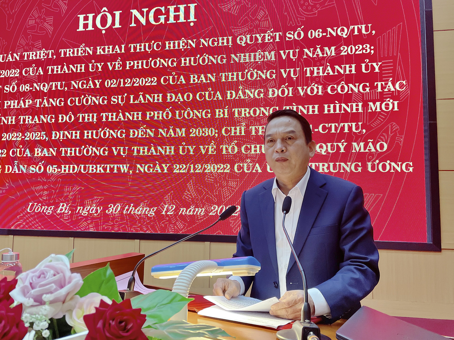Kết luận hội nghị, đồng chí Nghiêm Xuân Cường, Tỉnh ủy viên, Bí thư Thành ủy, Chủ tịch HĐND thành phố nhấn mạnh, năm 2023 là năm bản lề, giữa nhiệm kỳ, có ý nghĩa quan trọng tạo đà cho giai đoạn về đích. Bám sát các nội dung Nghị quyết, Chỉ thị, Hướng dẫn được quán triệt tại hội nghị, đồng chí đề nghị các cán bộ, đảng viên nhất là cán bộ chủ chốt, thủ trưởng các cơ quan, đơn vị cần nhận thức sâu sắc, tích cực học tập, trao đổi, quán triệt và triển khai nghiêm túc. Trong đó, đặc biệt chú trọng triển khai chủ đề công tác năm “Đẩy mạnh thu hút đầu tư, nâng cao chất lượng đời sống Nhân dân, chung tay chỉnh trang đô thị”; tăng cường sự lãnh đạo của Đảng đối với công tác xây dựng, chỉnh trang đô thị TP Uông Bí trong tình hình mới, giai đoạn 2022-2025, định hướng đến năm 2030. Sau hội nghị tiếp tục quán triệt, cần phổ biến, tuyên truyền rộng rãi nội dung các Chỉ thị, Nghị quyết trong cơ quan, đơn vị, các tầng lớp Nhân dân. Qua đó, tạo sự chuyển biến về nhận thức, thống nhất ý chí và quyết tâm hành động, thực hiện thắng lợi trong toàn đảng bộ.