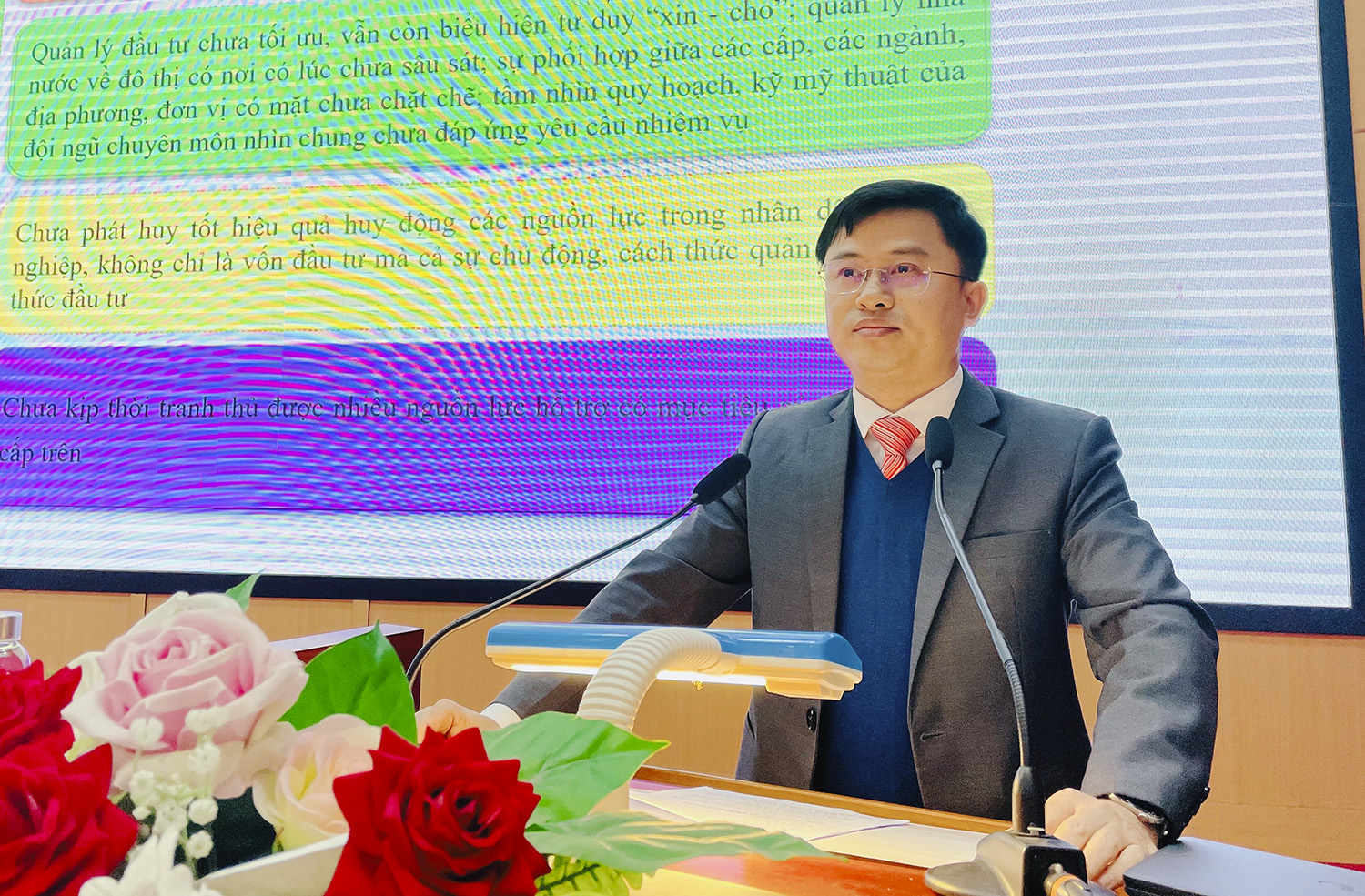 Đồng chí Nguyễn Đức Tiệp, Phó Chủ tịch UBND thành phố truyền đạt Nghị quyết số 08-NQ/TU, ngày 02/12/2022 của BTV Thành uỷ về “Một số giải pháp tăng cường sự lãnh đạo của Đảng đối với công tác xây dựng, chỉnh trang đô thị thành phố Uông Bí trong tình hình mới giai đoạn 2022-2025, định hướng đến năm 2030”.