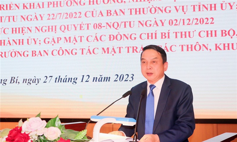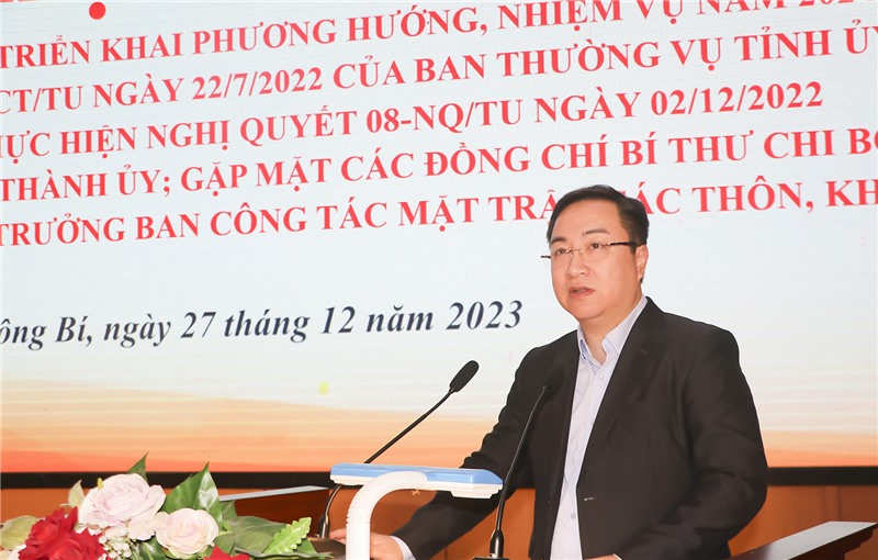 Phát biểu tại hội nghị, đồng chí Nghiêm Xuân Cường, Tỉnh ủy viên, Bí thư Thành ủy, Chủ tịch HĐND thành phố đề nghị các cấp uỷ, chính quyền, các đoàn thể, cơ quan, đơn vị cần tiếp thu đầy đủ, nghiêm túc ý kiến chỉ đạo của đồng chí Phó Bí thư Tỉnh ủy; tập trung thực hiện có hiệu quả các mục tiêu, chỉ tiêu, nhiệm vụ và giải pháp đề ra tại Nghị quyết số 10-NQ/TU ngày 05/12/2023 của BCH Đảng bộ thành phố về phương hướng, nhiệm vụ năm 2023 và Nghị quyết số 11-NQ/TU ngày 05/12/2023 của BCH Đảng bộ thành phố về tăng cường lãnh đạo công tác phát triển đảng trong tình hình hiện nay; tiếp tục thực hiện Nghị quyết số 08-NQ/TU, ngày 02/12/2022 của BTV Thành uỷ về chỉnh trang đô thị cùng các nhiệm vụ trọng tâm của năm 2024.
