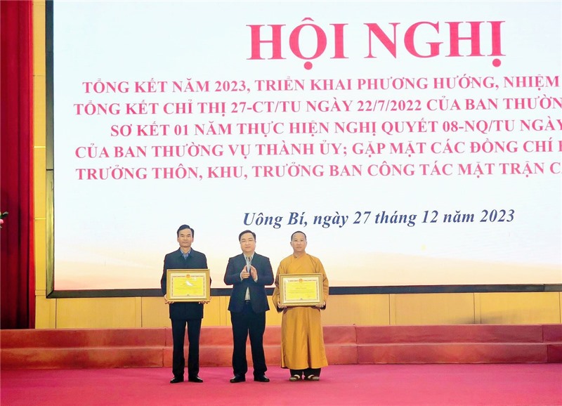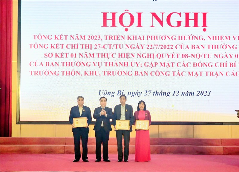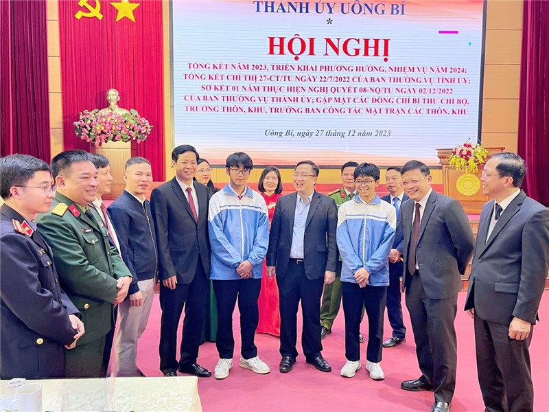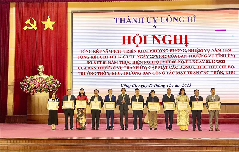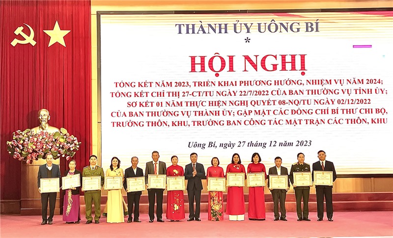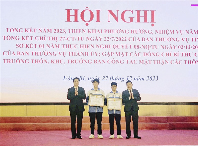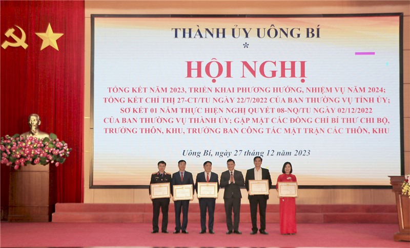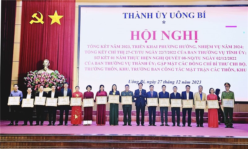 Tại hội nghị, UBND tỉnh đã khen thưởng 03 tập thể và 07 cá nhân tiêu biểu xuất sắc trong quá trình triển khai, xây dựng và gắn biển công trình “Cung Trúc Lâm Yên Tử” chào mừng kỷ niệm 60 năm ngày thành lập tỉnh Quảng Ninh. BTV Thành ủy khen thưởng 05 tổ chức cơ sở Đảng hoàn thành xuất sắc nhiệm vụ năm 2023; khen thưởng 27 tập thể và 54 cá nhân có thành tích xuất sắc trong các lĩnh vực công tác xây dựng Đảng năm 2023.
