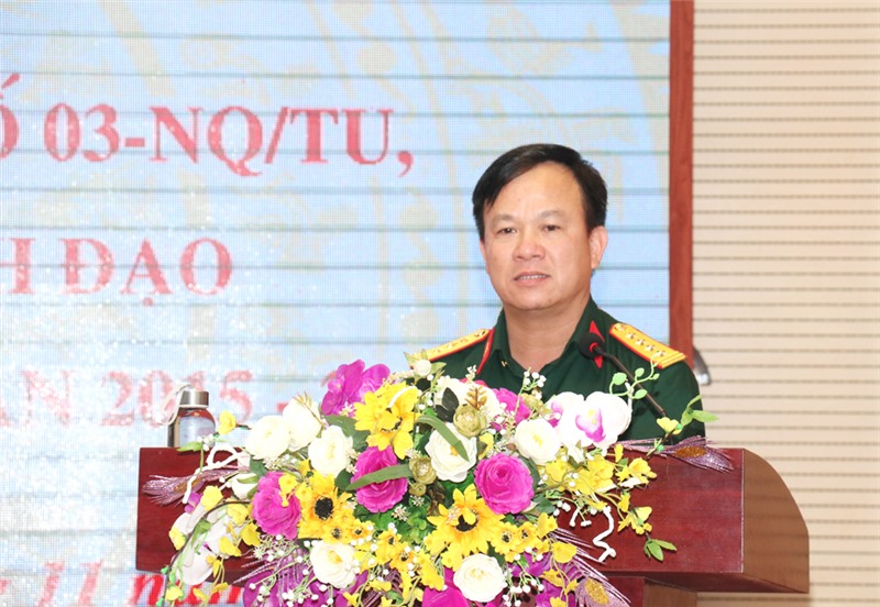 Đại tá Khúc Thành Dư, Phó Chỉ huy trưởng, Tham mưu trưởng Bộ Chỉ huy Quân sự tỉnh phát biểu tại hội nghị.