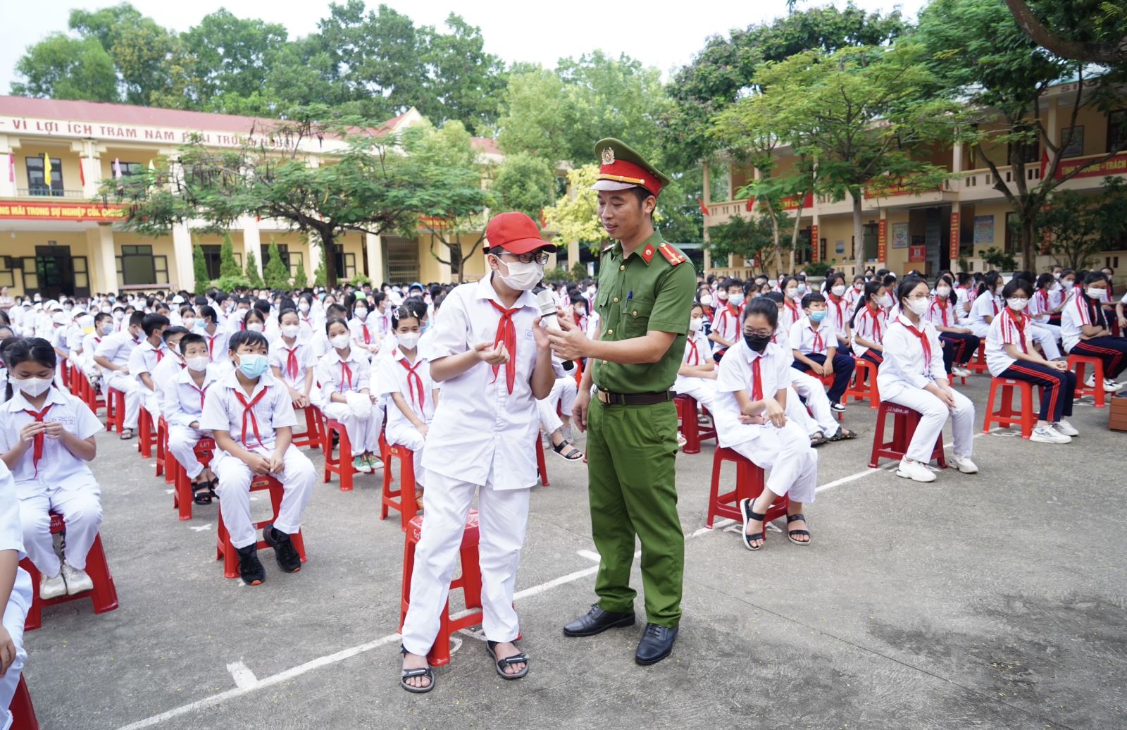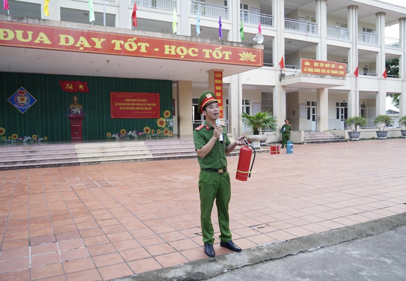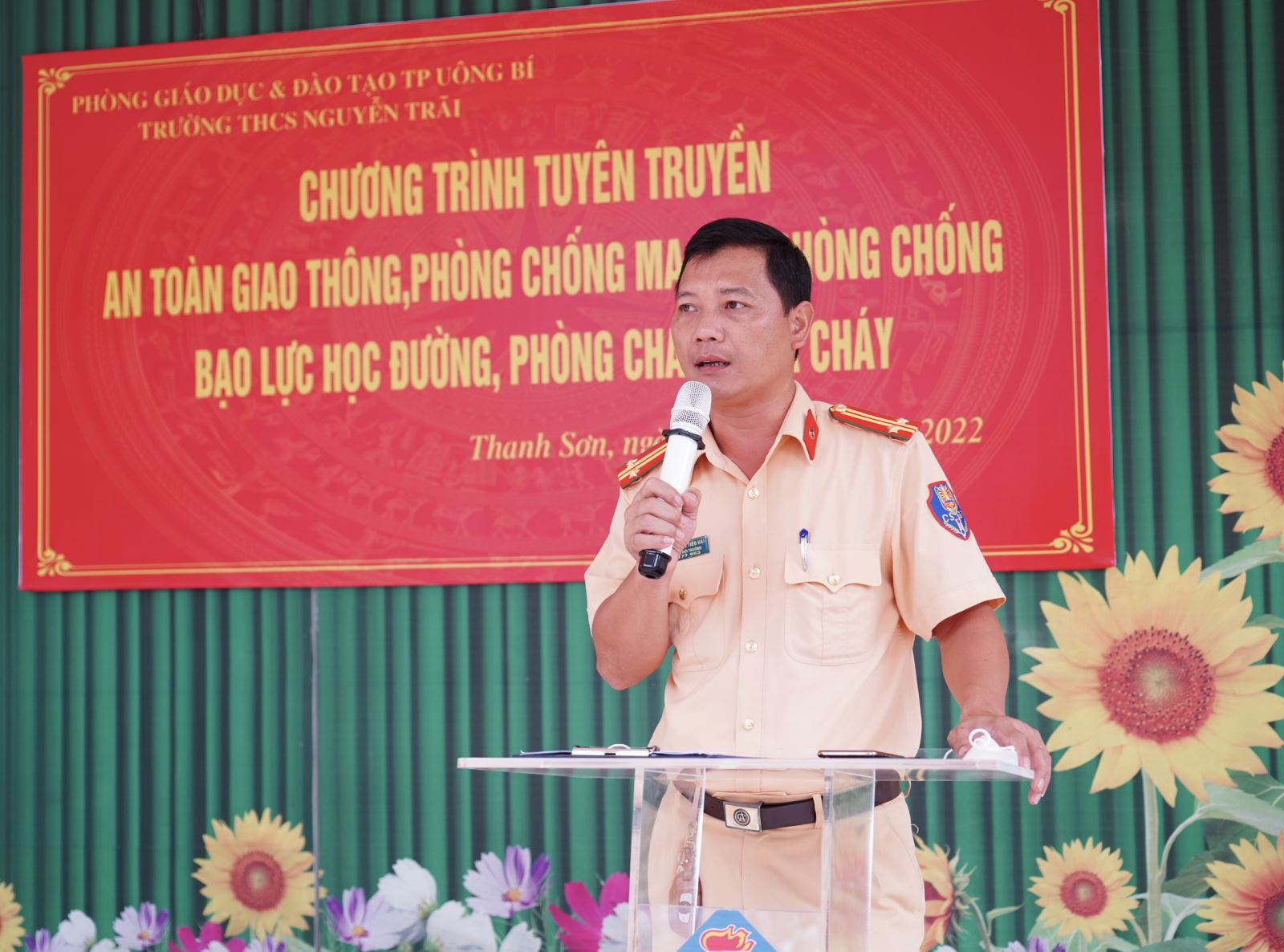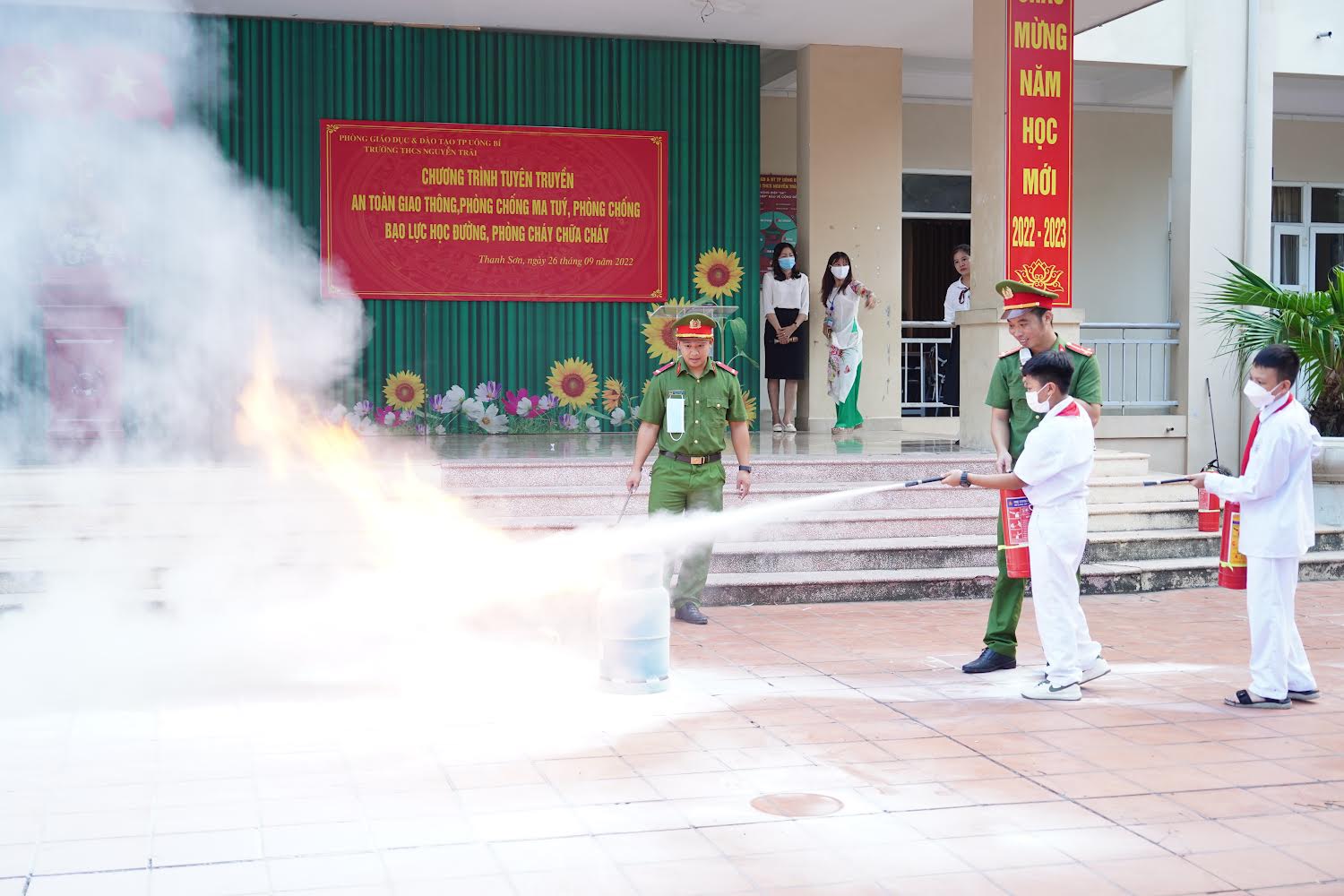 Một trong những ý nghĩa quan trọng của việc đổi mới hình thức, nội dung giờ chào cờ đầu tuần là tăng cường giáo dục ý thức đạo đức, tính kỷ luật và kỹ năng cho học sinh. Cũng trong chương trình chào cờ đầu tuần ngày 26/9, Trường THCS Nguyễn Trãi đã phối hợp với Đoàn TNCS Hồ Chí Minh phường Thanh Sơn và Công an thành phố Uông Bí tổ chức lồng ghép các nội dung tuyên truyền về kiến thức, kỹ năng cho học sinh như đảm bảo an toàn giao thông, phòng chống cháy nổ. Theo đó, cán bộ, chiến sỹ các đội nghiệp vụ Công an thành phố đã trực tiếp tuyên truyền những quy định của Luật Giao thông đường bộ, hướng dẫn các em kỹ năng tham gia giao thông an toàn; nhận biết các nguy cơ mất an toàn cháy nổ, các kỹ năng phòng chống cháy nổ, kỹ năng thoát hiểm khi có đám cháy. Các em học sinh và các thầy cô giáo còn được trực tiếp thực hành kỹ năng dập tắt đám cháy bằng bình bột.