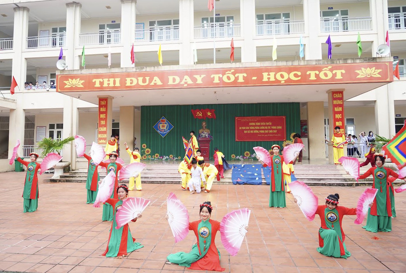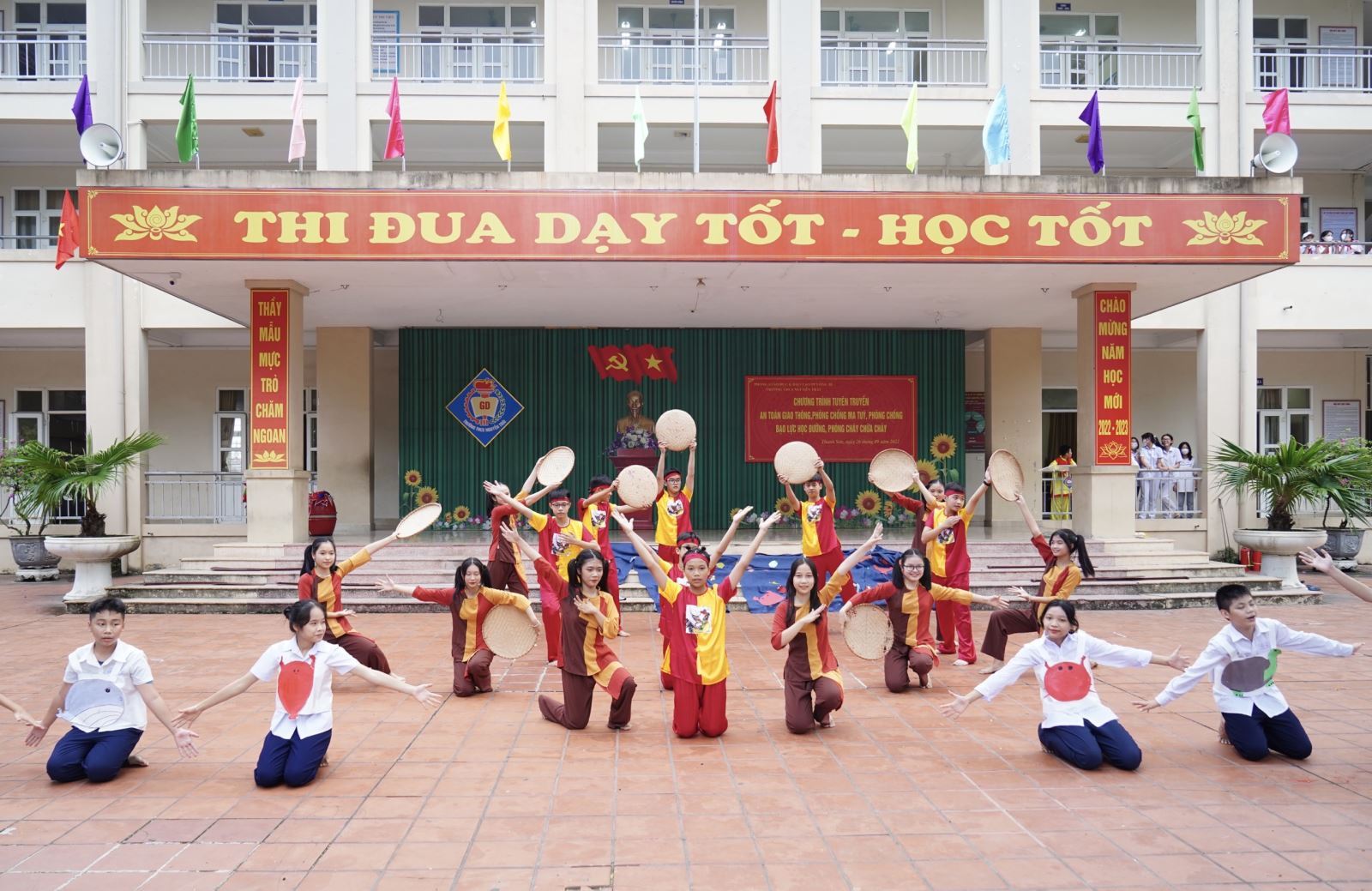 Giờ chào cờ đầu tuần vào thứ 2 ngày 26/9 của Trường THCS Nguyễn Trãi trở nên sôi động và thú vị hơn rất nhiều. Mở màn là 2 tiết mục văn nghệ tươi vui, rộn rã do các em học sinh khối 8,9 thể hiện. Chương trình văn nghệ đã được các em chuẩn bị hết sức công phu, nghiêm túc cả về phục trang, đạo cụ, biểu diễn… thu hút sự cổ vũ của đông đảo học sinh, tạo hứng khởi cho một tuần học tập mới tràn đầy năng lượng và hiệu quả. Thông qua việc tham gia lên ý tưởng và chuẩn bị cho chương trình đã khơi dậy, cổ vũ tinh thần chủ động, sáng tạo của các em học sinh, lan tỏa những thông điệp giáo dục ý nghĩa dưới góc nhìn và sự thể hiện của các em.