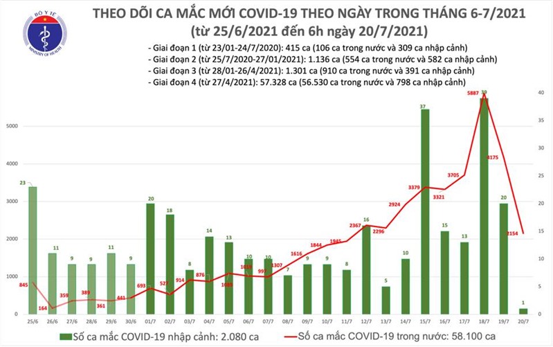 Tính từ 18h30 ngày 19/7 đến 6h ngày 20/7 cả nước có thêm 2.155 ca mắc COVID-19 mới (BN58026-60180), trong đó 1 ca nhập cảnh và 2.154 ca ghi nhận trong nước.