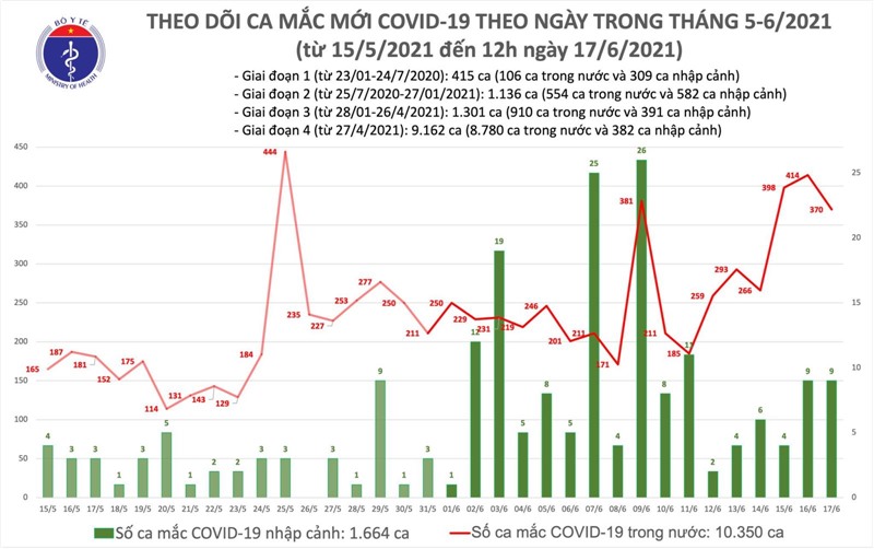 Như vậy, tính đến 12h ngày 17/6, Việt Nam có 10.350 ca ghi nhận trong nước và 1.664 ca nhập cảnh. Số lượng ca mắc mới tính từ ngày 27/4 đến nay là 8.780 ca, trong đó có 1.816 bệnh nhân đã được công bố khỏi bệnh.