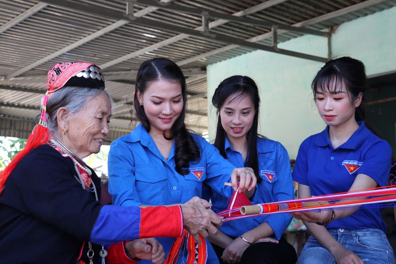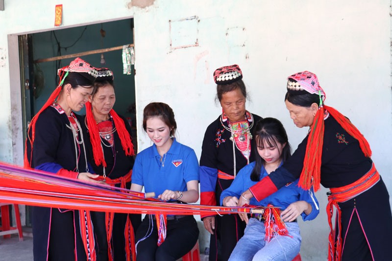 Cùng các bà các mẹ người Dao Thanh Y học cách dệt truyền thống.
