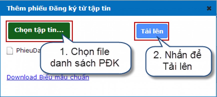 Điểm TNHS nhấn nút “Thêm phiếu đăng ký mới từ tập tin” trên màn hình danh sách phiếu đăng ký, màn hình hệ thống sẽ hiển thị popup Thêm phiếu đăng ký từ tập tin.