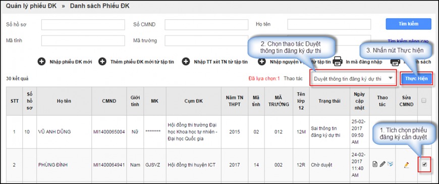 Để duyệt hồ sơ đăng ký dự thi của thí sinh, điểm TNHS tích chọn các hồ sơ cần duyệt, sau đó vào mục Thao tác chọn “Duyệt thông tin đăng ký dự thi” và nhấn “Thực hiện”.