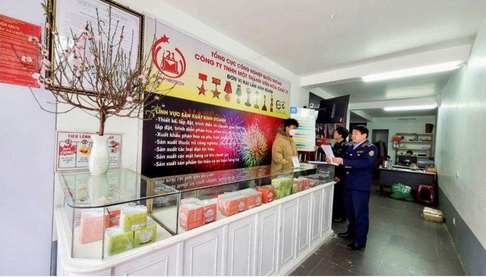 Đội Quản lý thị trường số 6 tuyên truyền, ký cam kết chấp hành các quy định pháp luật trong hoạt động kinh doanh tại cửa hàng kinh doanh pháo hoa trên địa bàn phường Quang Trung. Ảnh: Trần Đức, Đội QLTT số 6