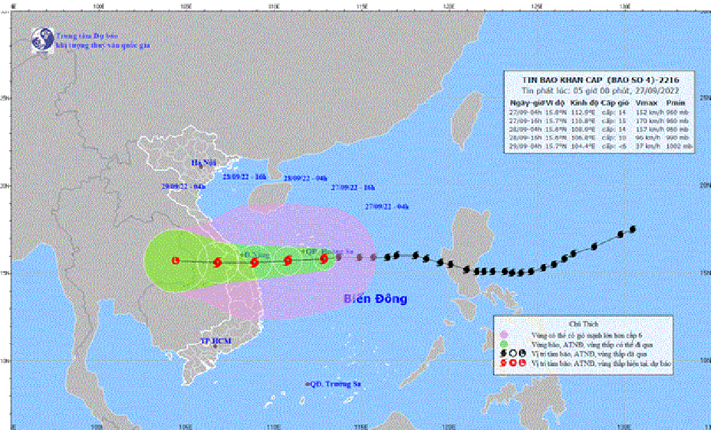 Theo Trung tâm Dự báo Khí tượng Thủy văn Quốc gia, hồi 4 giờ ngày 27/9, vị trí tâm bão số 4 ở trên vùng biển phía Đông Nam quần đảo Hoàng Sa. Sức gió mạnh nhất vùng gần tâm bão mạnh cấp 14 (150-166 km/giờ), giật cấp 16.
