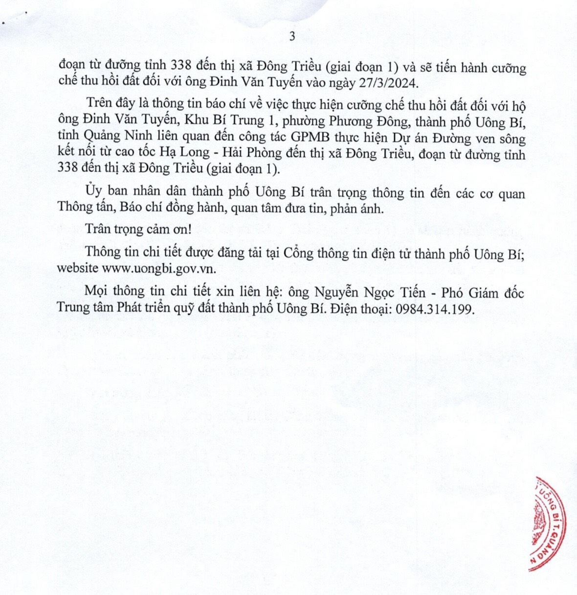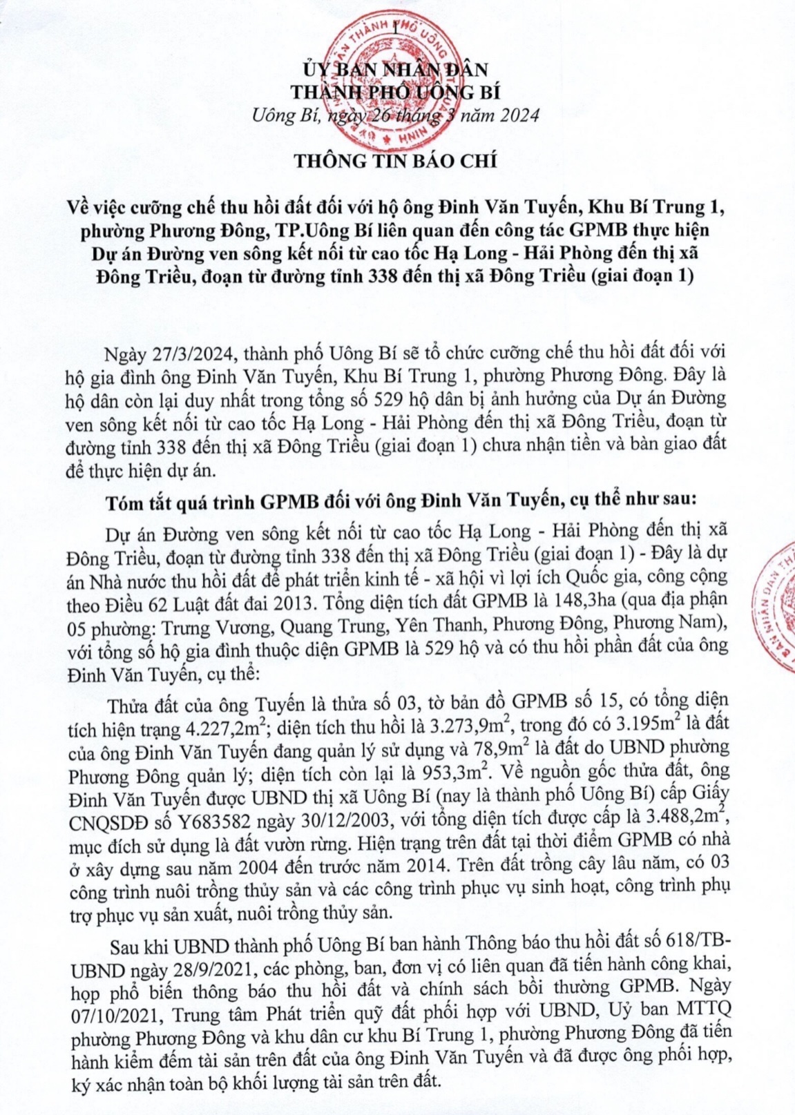 Thông tin báo chí (về việc cưỡng chế thu hồi đất đối với hộ ông Đinh Văn Tuyến)