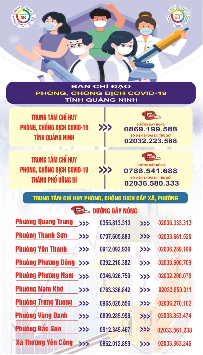Hiện nay, Thành phố Uông Bí đã phát hiện một số ca dương tính với Covid -19 tại Công ty Giầy da Sao Vàng chi nhánh Uông Bí. Thành phố đang thần tốc triển khai các biện pháp truy vết, khoanh vùng, lấy mẫu. Thành phố thông tin và đề nghị Nhân dân hết sức bình tĩnh để Ban Chỉ đạo phòng chống dịch Covid-19 thành phố tập trung chỉ đạo, triển khai các biện pháp cần thiết. Yêu cầu các gia đình có người làm việc tại Công ty Giầy da Sao Vàng chi nhánh Uông Bí hạn chế đi lại, giao tiếp; nhanh chóng liên hệ với Ban chỉ đạo các xã phường hoặc Tổ covid -19 cộng đồng theo số điện thoại dưới đây để được hướng dẫn: