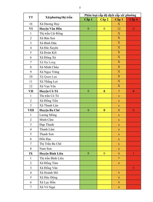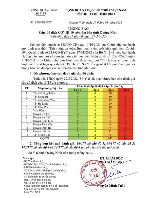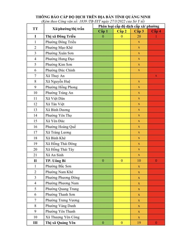 Thông báo cấp độ dịch Covid-19 trên địa bàn tỉnh Quảng Ninh (tính đến 17h00 ngày 27/3/2022)