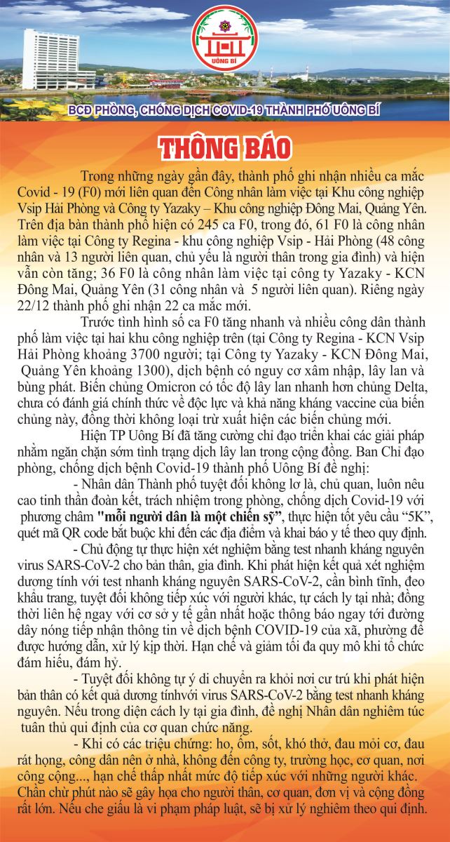 Thông báo của Ban chỉ đạo phòng, chống dịch Covid-19 thành phố Uông Bí ngày 23/12/2021