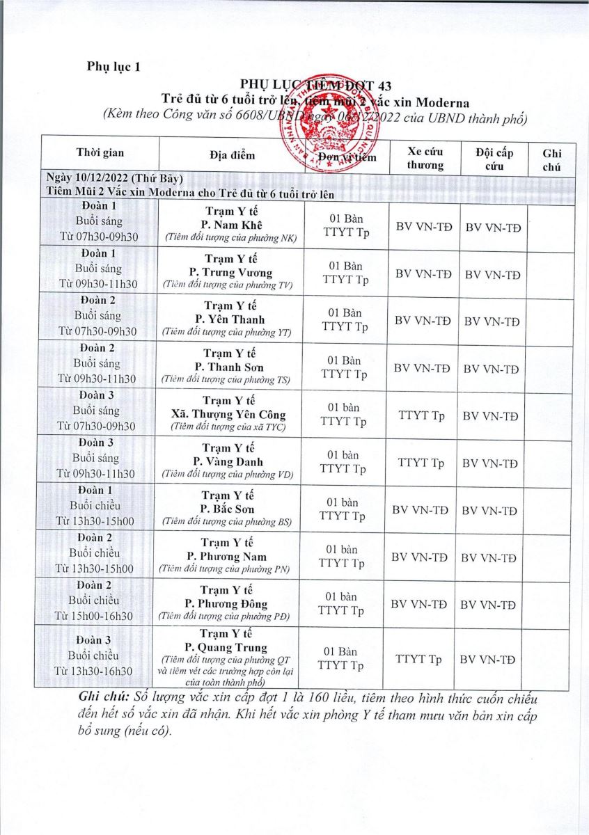 Thông báo lịch tiêm mũi 2 vắc xin Moderna cho trẻ từ đủ 6 tuổi trở lên trên địa bàn thành phố (Đợt 43, tháng 12/2022)