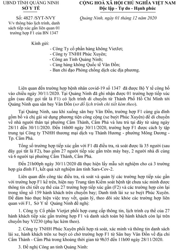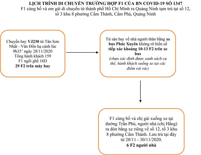 Thông báo lịch trình, danh sách tiếp xúc gần liên quan 01 trường hợp F1 của BN 1347