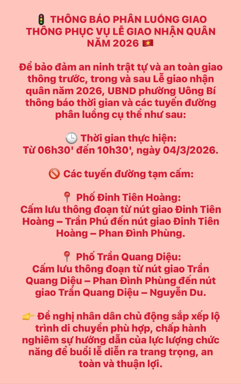 THÔNG BÁO PHÂN LUỒNG GIAO THÔNG PHỤC VỤ LỄ GIAO NHẬN QUÂN NĂM 2026