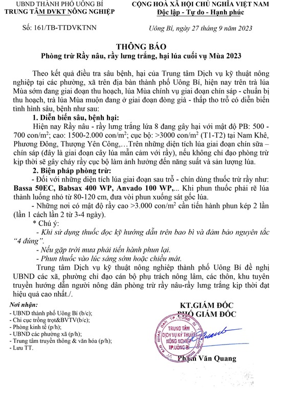 Thông báo số 161/TB-TTDVKTNN ngày 27/9/2023 của Trung tâm DVKT nông nghiệp thành phố về phòng trừ Rầy nâu, rầy lưng trắng hại lúa cuối vụ Mùa 2023.