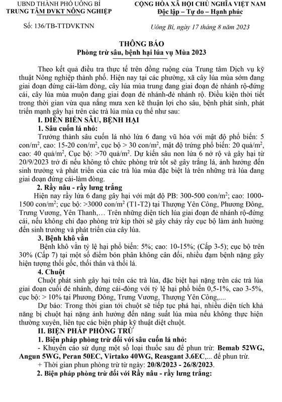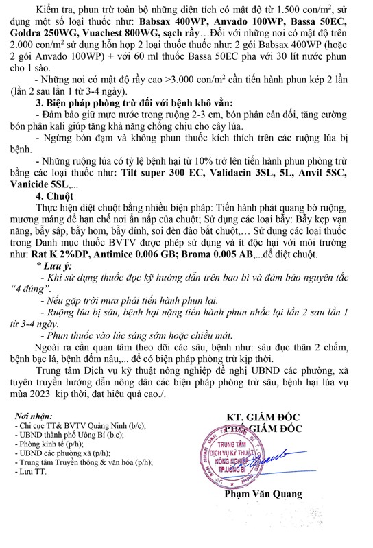 Thông báo Phòng trừ sâu, bệnh hại lúa vụ Mùa 2023