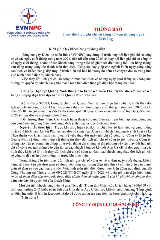 Thông báo thay đổi lịch ghi chỉ số công tơ vào những ngày cuối tháng