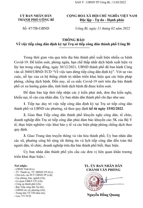 Thông báo tiếp tục tiếp công dân định kỳ tại Trụ sở Tiếp công dân thành phố Uông Bí