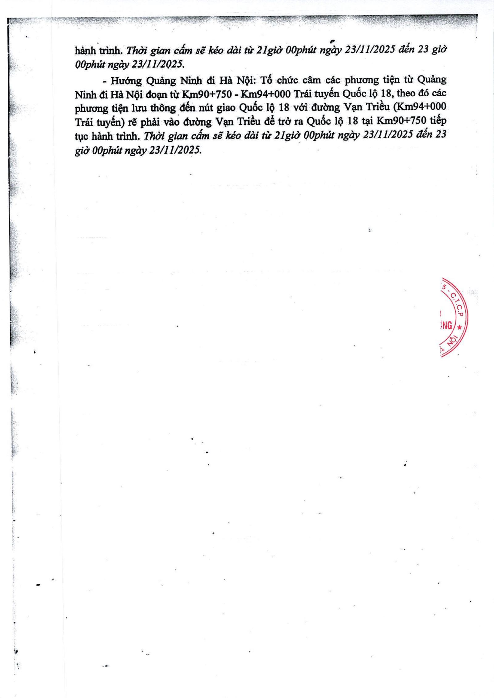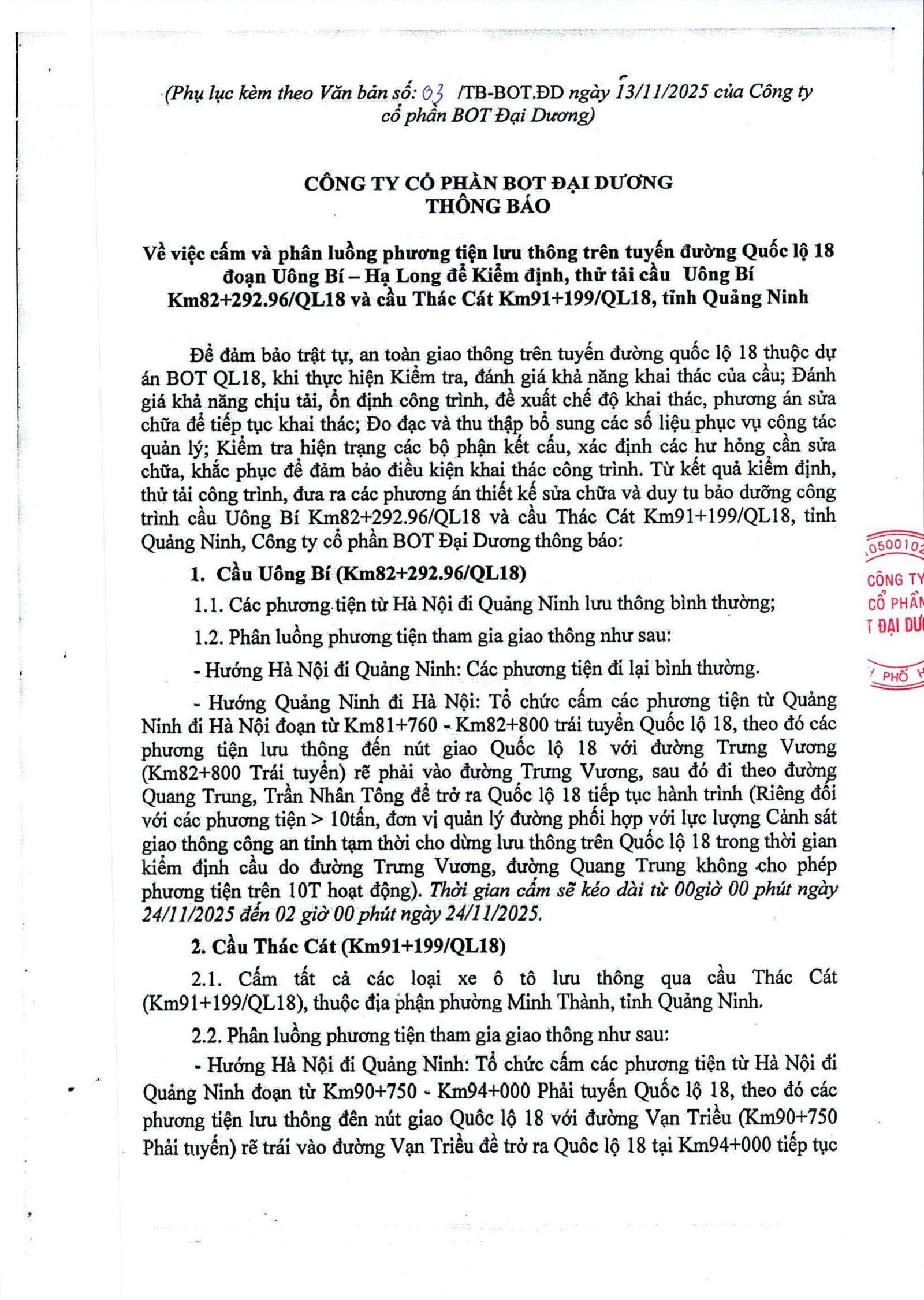 Thông báo về việc cấm và phân luồng phương tiện lưu thông trên tuyến đường Quốc lộ 18 đoạn Uông Bí - Hạ Long