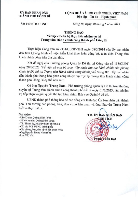Vừa qua, Ủy ban nhân dân Thành phố Uông Bí ban hành Thông báo số 1401/TB-UBND về việc cử cán bộ thực hiện nhiệm vụ tại Trung tâm Hành chính công thành phố Uông Bí.