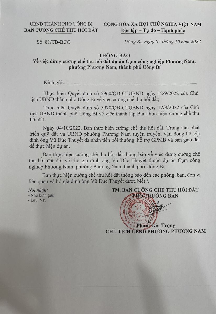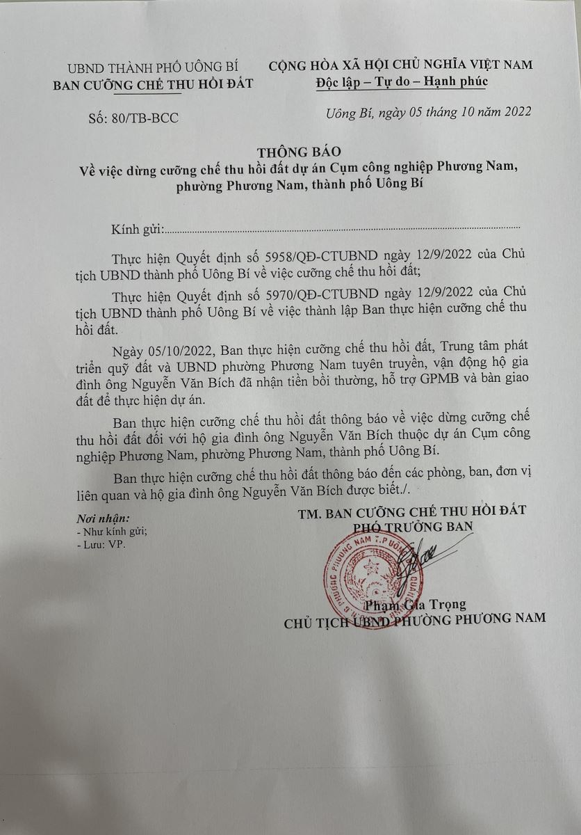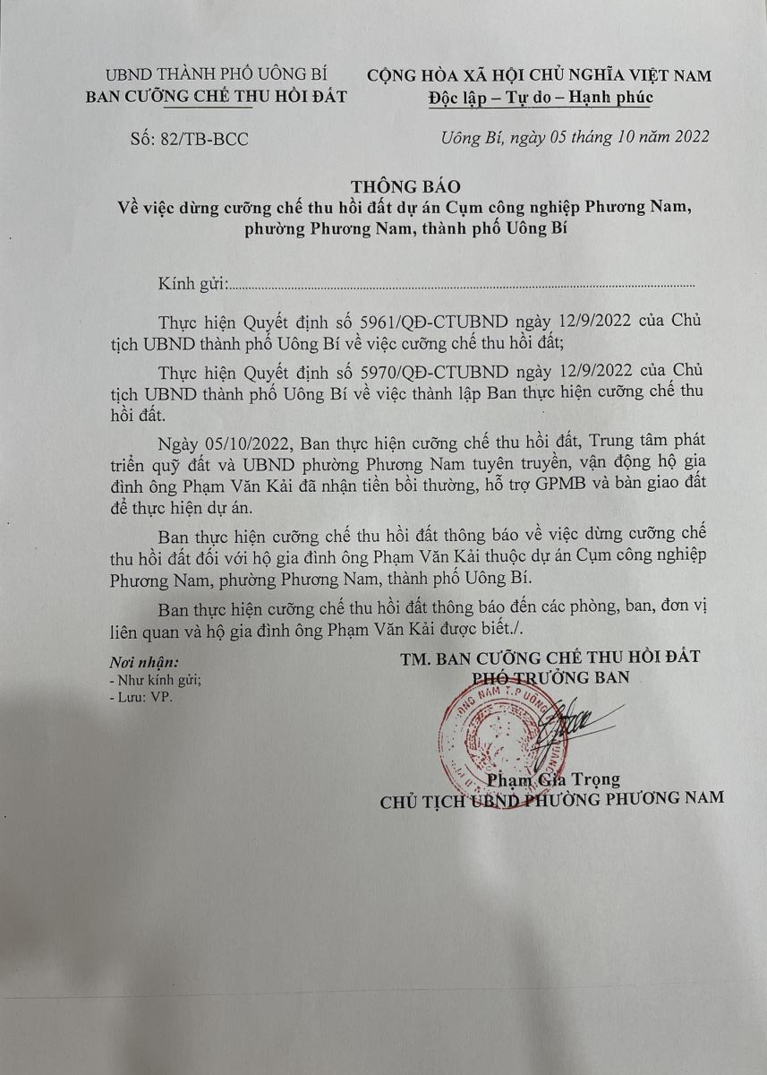 Thông báo về việc dừng cưỡng chế thu hồi đất đối với những hộ dân đã đồng thuận nhận tiền và bàn giao đất thuộc dự án Cụm công nghiệp Phương Nam, phường Phương Nam, TP Uông Bí