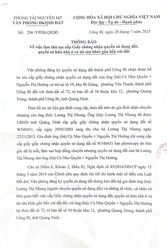Ngày 28-7, Văn phòng đăng ký quyền sử dụng đất ban hành Thông báo số 296/VPĐKQSDĐ về việc làm thủ tục cấp giấy chứng nhận quyền sử dụng đất, quyền sở hữu nhà ở và tài sản khác gắn liền với đất.