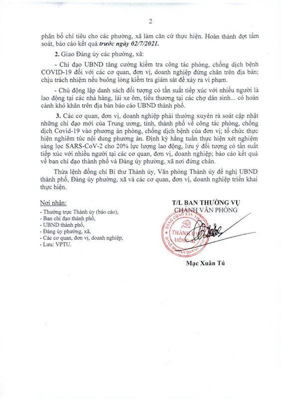 Thông báo ý kiến chỉ đạo của đồng chí Bí thư Thành ủy, Trưởng BCĐ phòng chống dịch COVID-19 thành phố về tăng cường triển khai các biện pháp phòng, chống dịch COVID-19