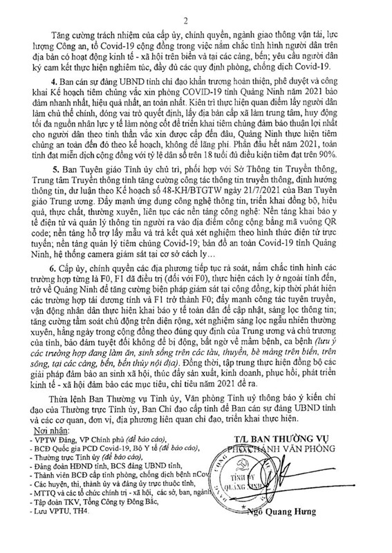 Mới đây, Thường trực Tỉnh ủy, Ban chỉ đạo cấp tỉnh ban hành Thông báo số 284-TB/TU để Thông báo ý kiến chỉ đạo của Thường trực Tỉnh ủy, Ban chỉ đạo cấp tỉnh về phòng, chống dịch Covid-19 về việc triển khai các biện pháp cấp bách phòng, chống dịch Covid-19 trong tình hình mới tại hội nghị ngày 26/7/2021.