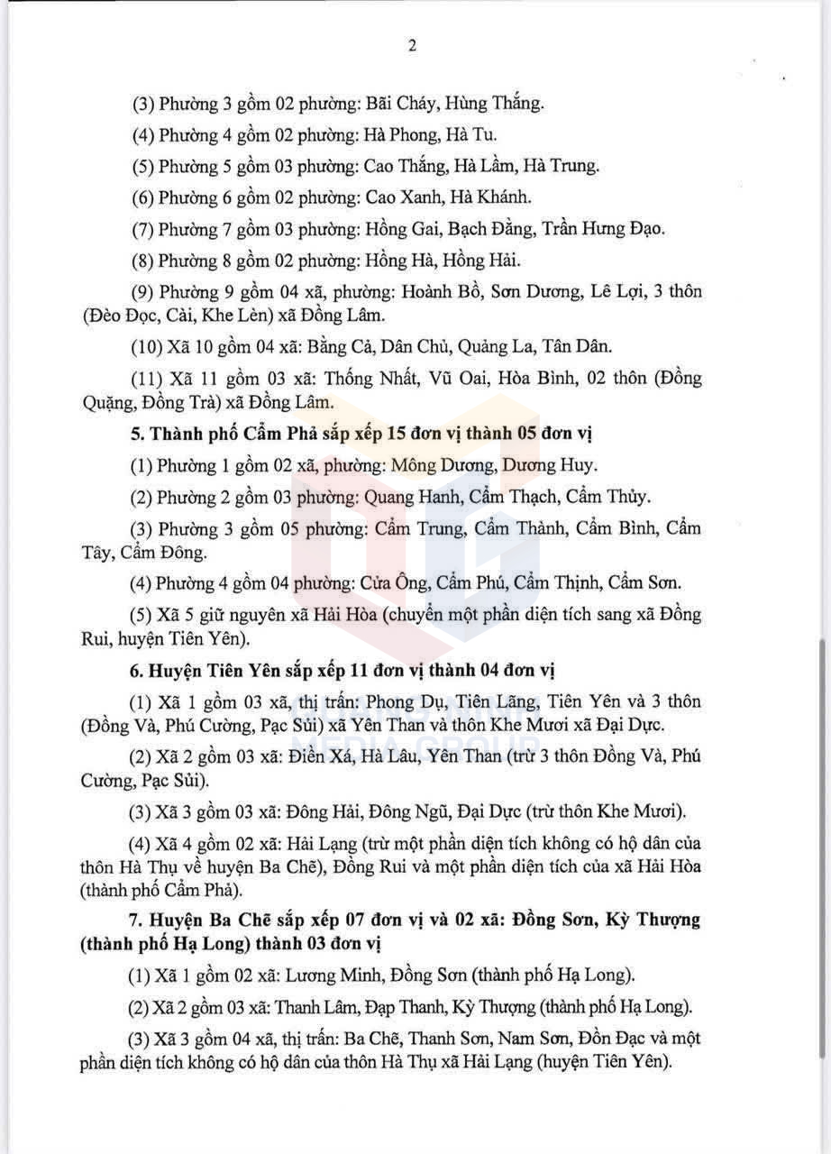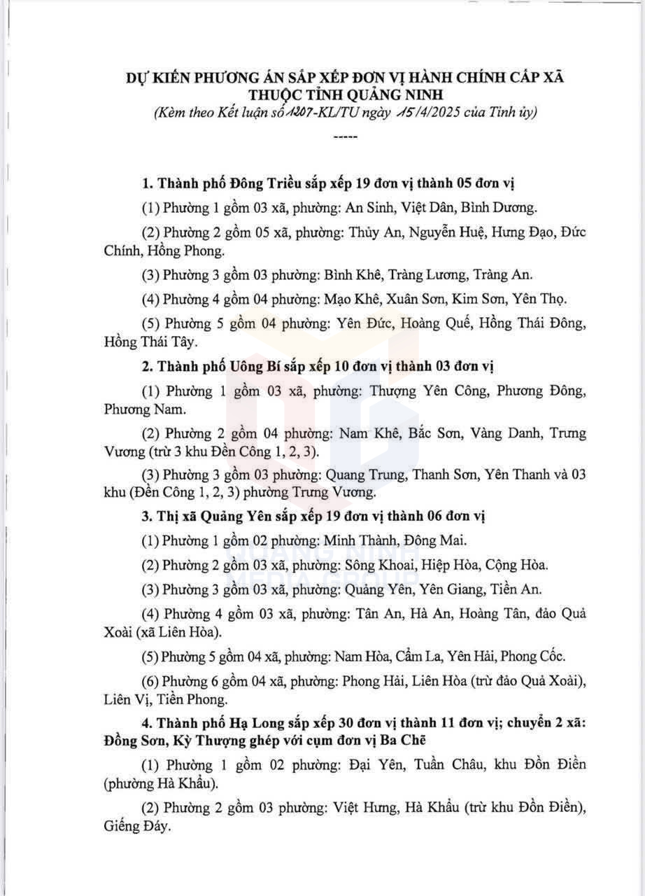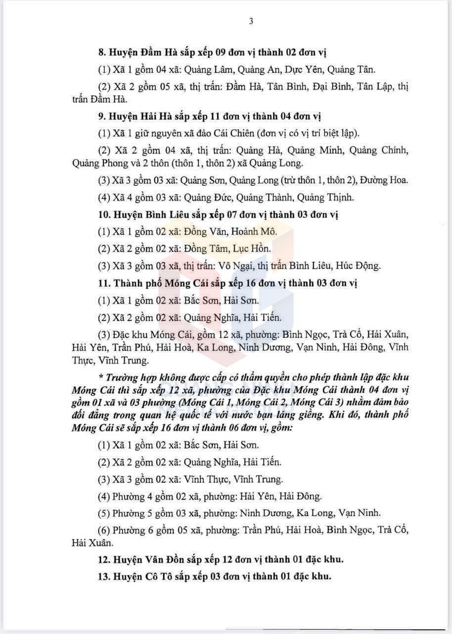 Trường hợp Trung ương phê duyệt 02 đặc khu (Vân Đồn, Cô Tô) thì sắp xếp các đơn vị hành chính cấp xã toàn tỉnh thành 54 đơn vị, gồm: 30 phường, 22 xã và 02 đặc khu.