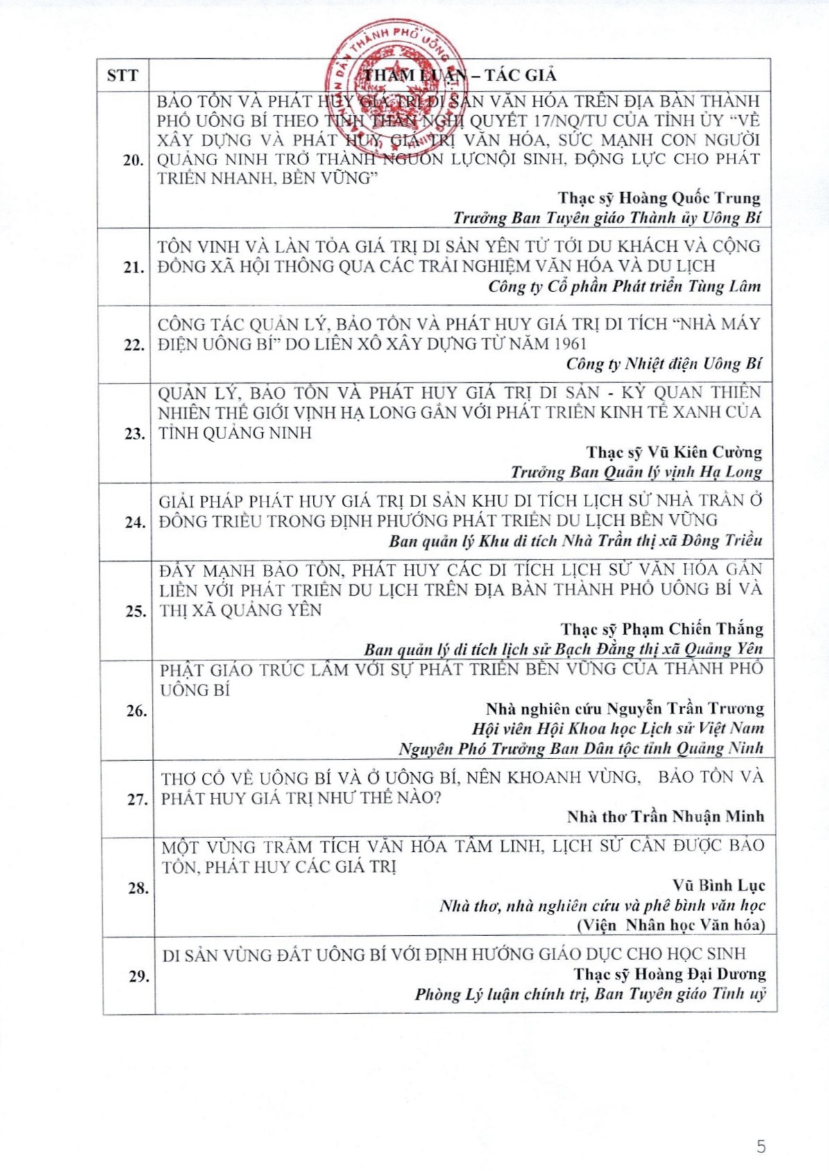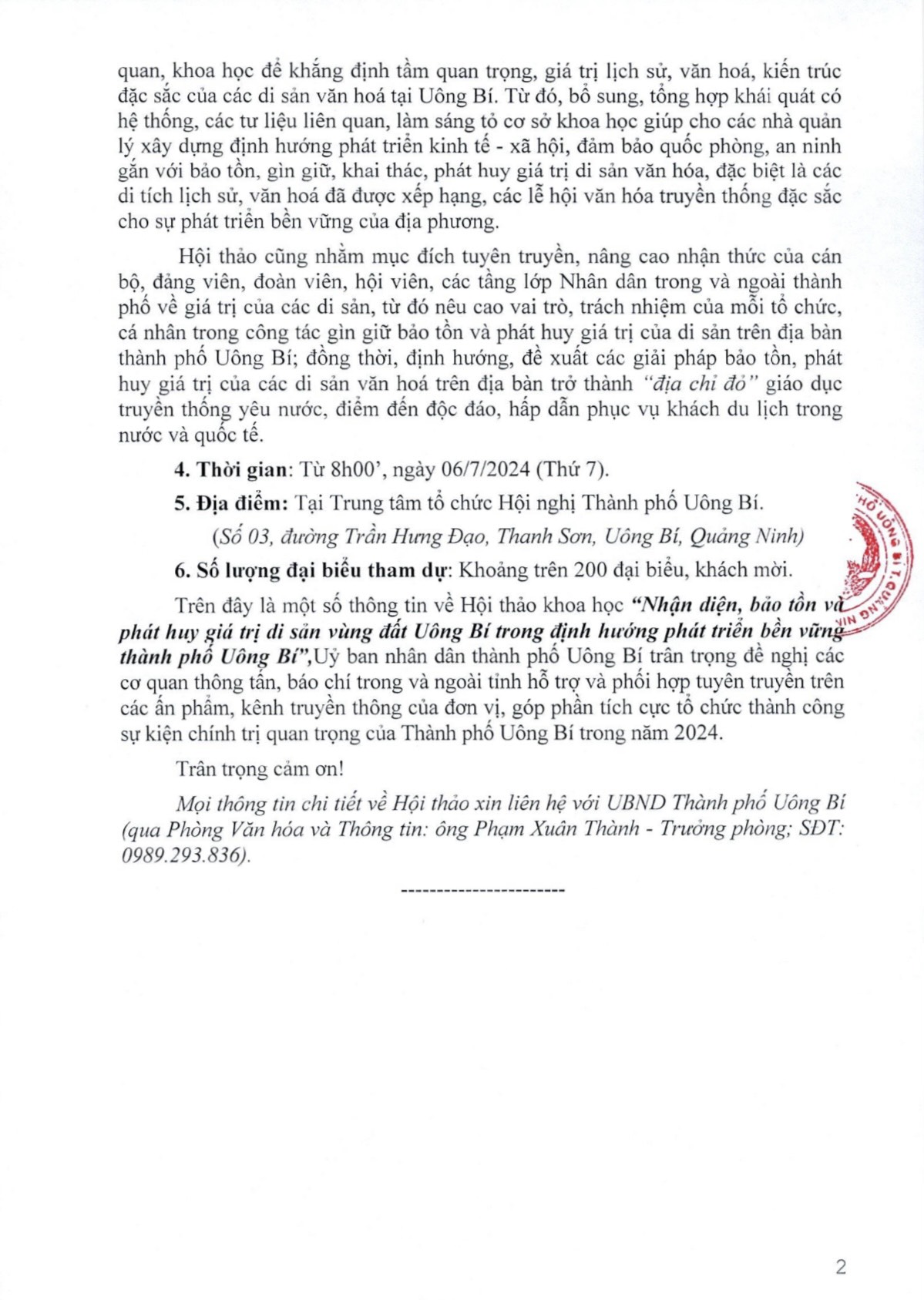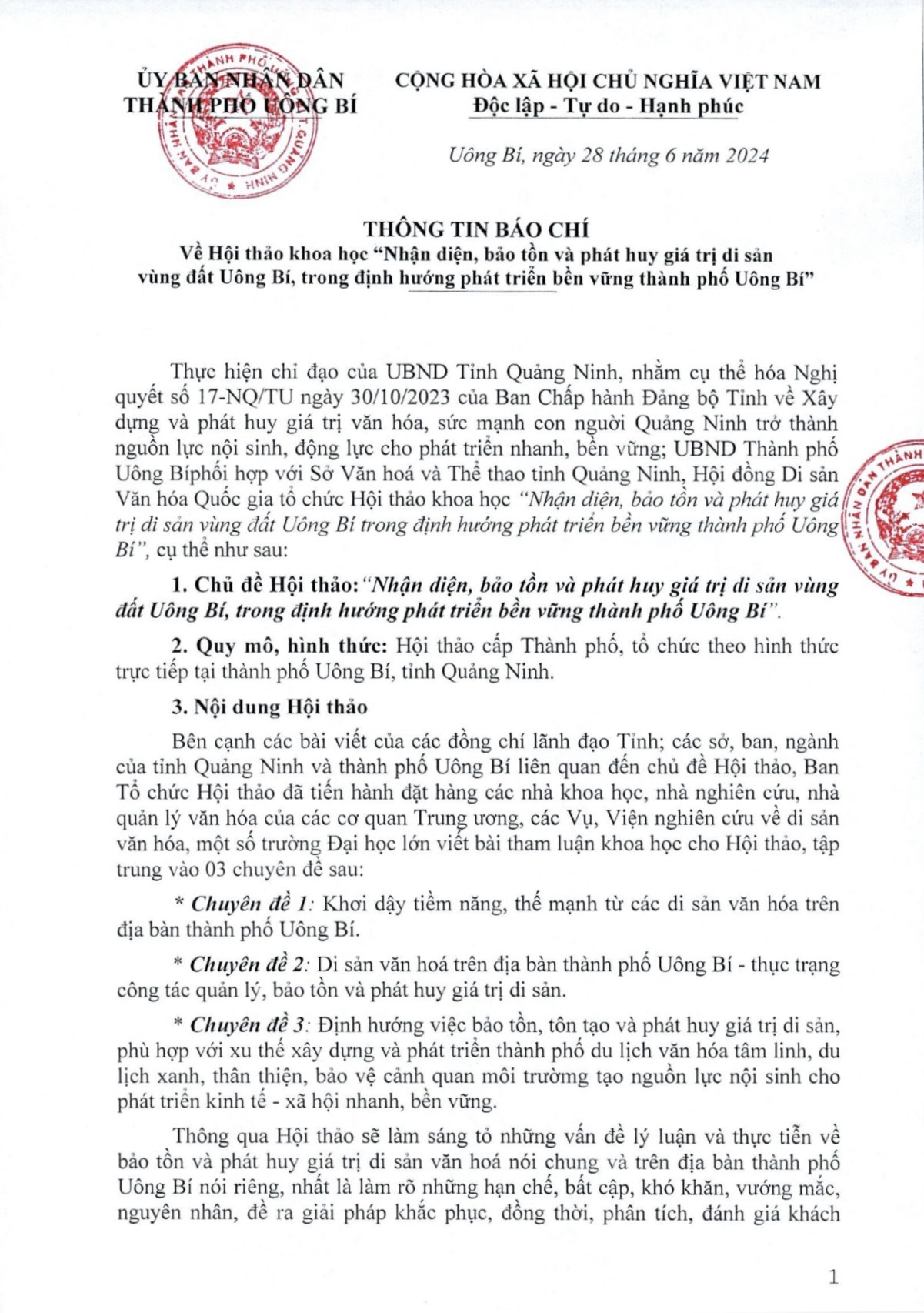 Thông tin báo chí về Hội thảo khoa học “Nhận diện, bảo tồn và phát huy giá trị di sản vùng đất Uông Bí, trong định hướng phát triển bền vững thành phố Uông Bí”