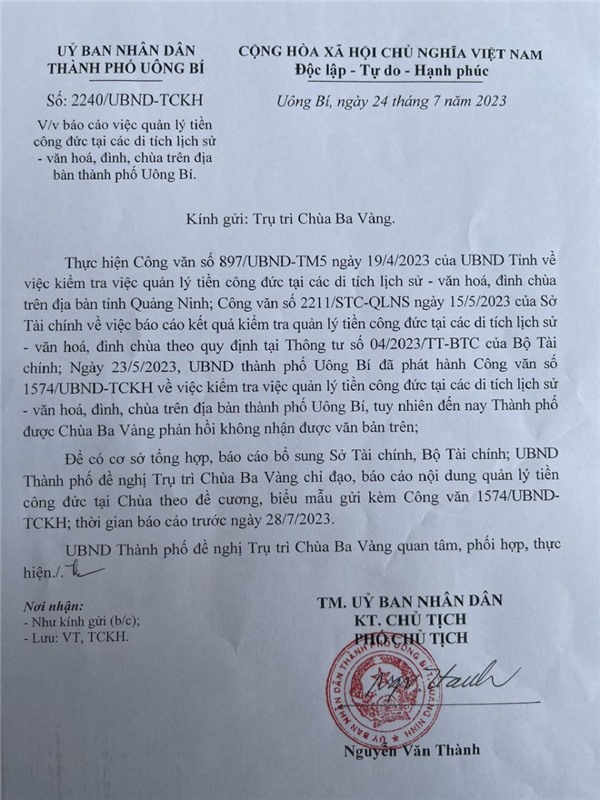 Ngày 15/5/2023, UBND thành phố đã ban hành Quyết định số 2501/QĐ-UBND về việc thành lập Đoàn kiểm tra đối với các di tích lịch sử- văn hoá, đình chùa trên địa bàn thành phố và ban hành Công văn số 1574/UBND-TCKH ngày 23/5/2023 về việc kiểm tra việc quản lý tiền công đức tại các di tích lịch sử - văn hoá, đình, chùa trên địa bàn thành phố gửi các di tích lịch sử - văn hoá có thu tiền công đức gửi chùa Ba Vàng, trong đó đề nghị chùa báo cáo theo đề cương hướng dẫn gửi kèm.