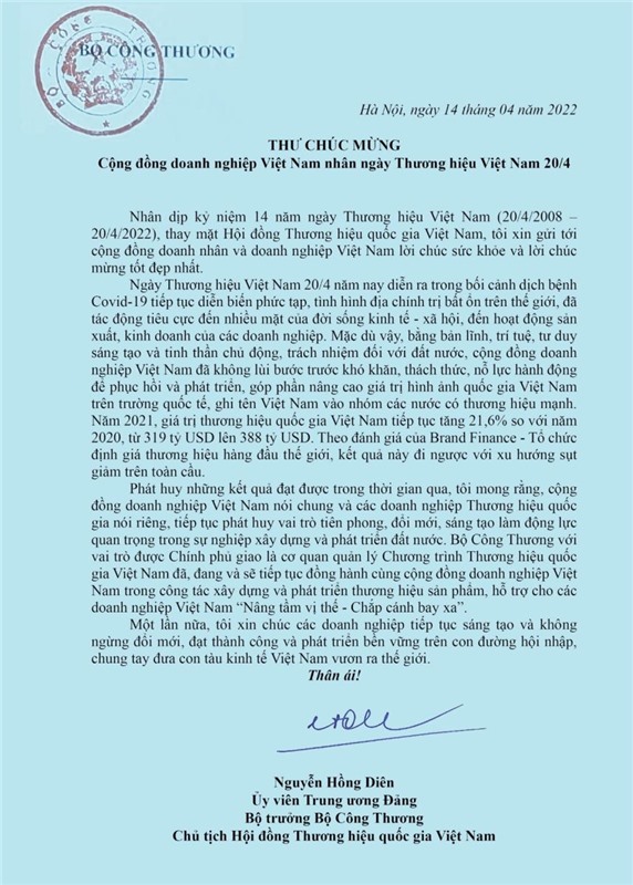 Thư chúc mừng Cộng đồng doanh nghiệp Việt Nam nhân ngày Thương hiệu Việt Nam 20/4 của Bộ trưởng Bộ Công thương