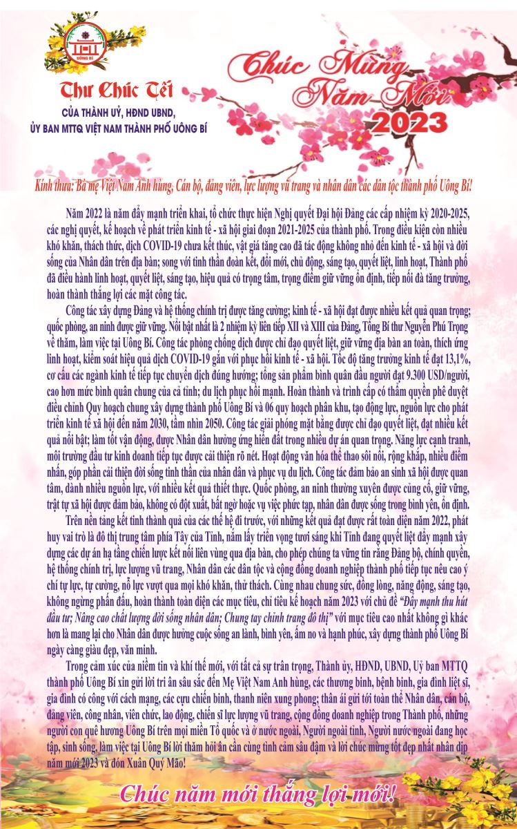 Thư chúc Tết của Thành ủy, HĐND, UBND, Ủy ban MTTQ Việt Nam thành phố Uông Bí
