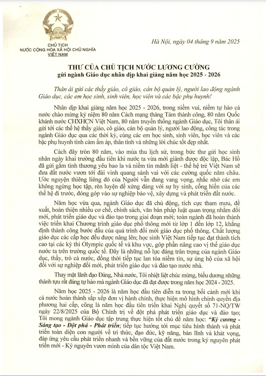 Thư của Chủ tịch nước Lương Cường gửi ngành giáo dục nhân dịp khai giảng năm học 2025-2026.